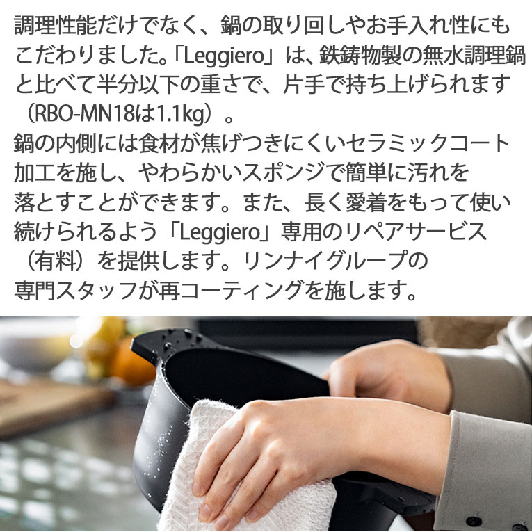 誰でも取り回ししやすい圧倒的な軽さを実現しました。また、熱伝導性に長けているため、鍋全体が温まるのに時間がかかりません。セラミックコート加工により、焦げつきにくく、お手入れも簡単です。