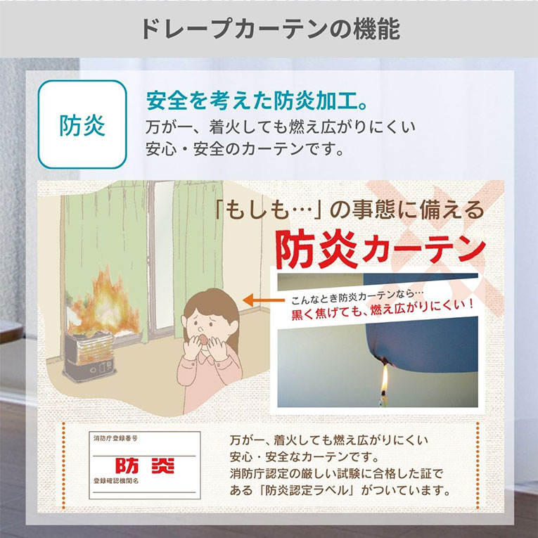 形状記憶加工付、防炎加工機能付ドレープカーテン