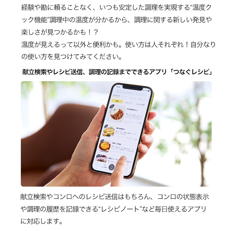| 操作性能 | レンジフード連動 光る操作ボタン※1「つなぐレシピ」アプリ対応 |