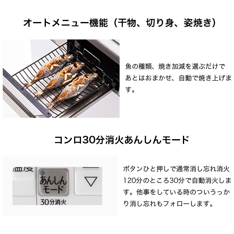 …調理油過熱防止装置/立消え安全装置/焦げつき消火機能、コンロ・グリル消し忘れ消火機能、フレームトラップ・グリル過熱防止機能、ロック、コンロ30分消火あんしんモード、カスタマイズ機能、レンジフード連動機能、感震停止機能、低荷重温度センサー。