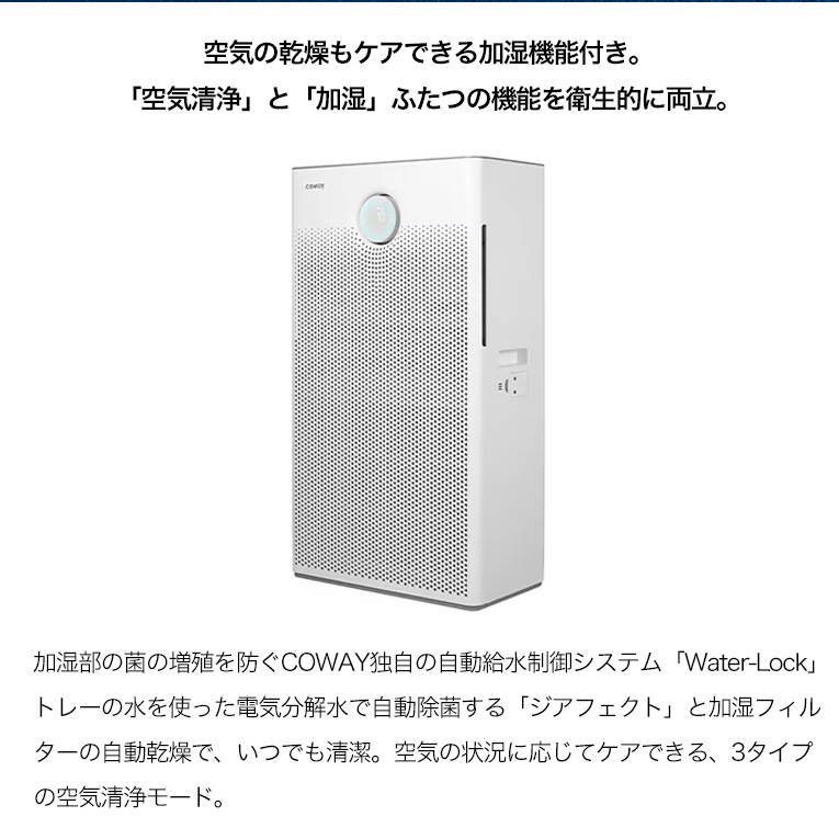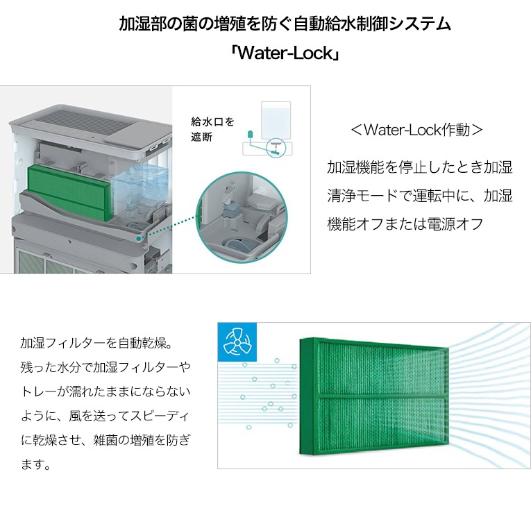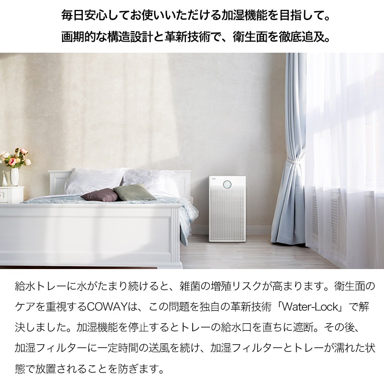 加湿部の菌の増殖を防ぐCOWAY独自の自動給水制御システム「Water-Lock」。