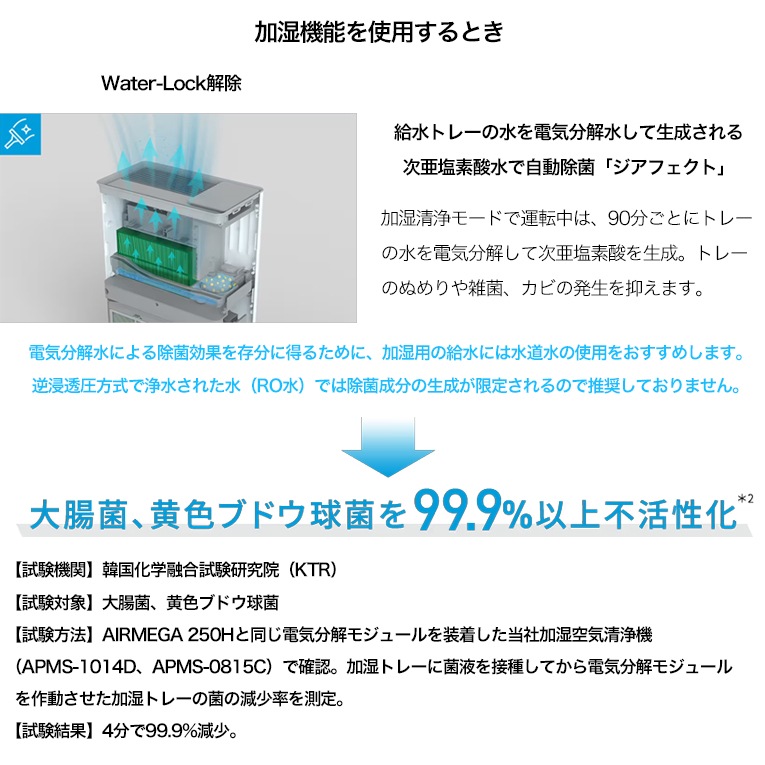 トレーの水を使った電気分解水で自動除菌する「ジアフェクト」と加湿フィルターの自動乾燥で、いつでも清潔。