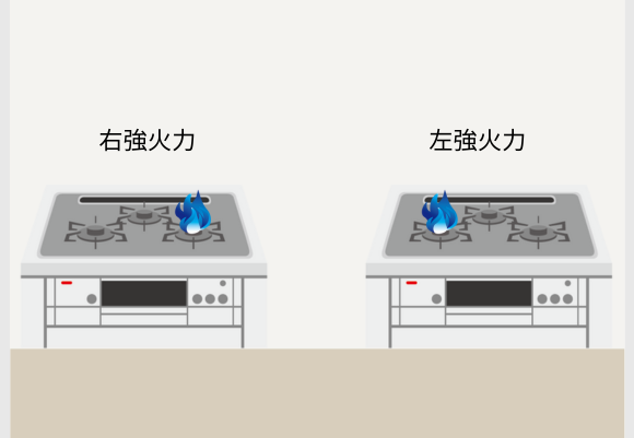 強火力バーナーが左右どちら側になるか確認しましょう。選定の基準として壁の反対側が強火力になると良いとされています。