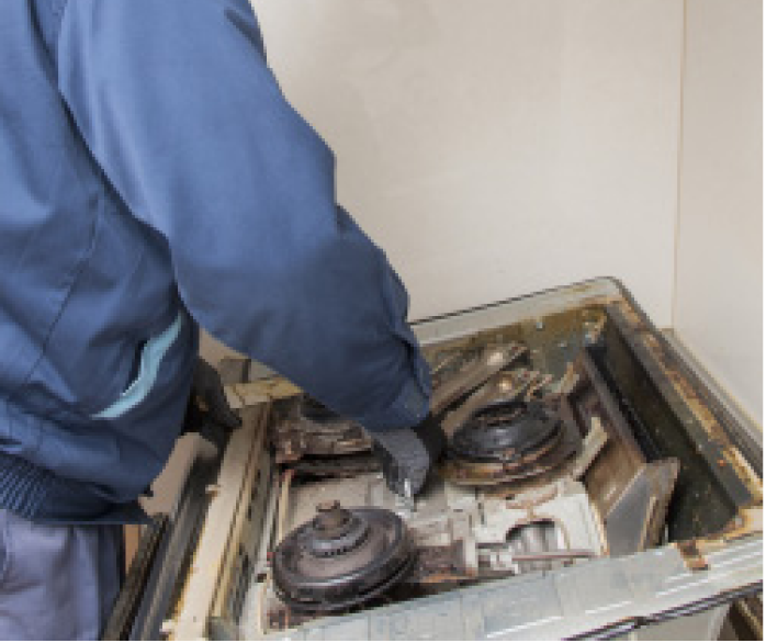 「グリル下に固定の棚板があったり、ガス栓の位置などによっては時間がかかる場合も。ここはガス栓が左下、棚板なしで理想的な条件。スムーズに終わりそうです」