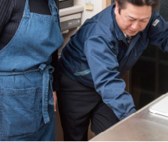 取替えが完了。確認しながら使い方の丁寧な説明が行われます。 「バーナー周りやゴトクがずいぶんすっきりしましたね」とTさんも満足の様子です。
